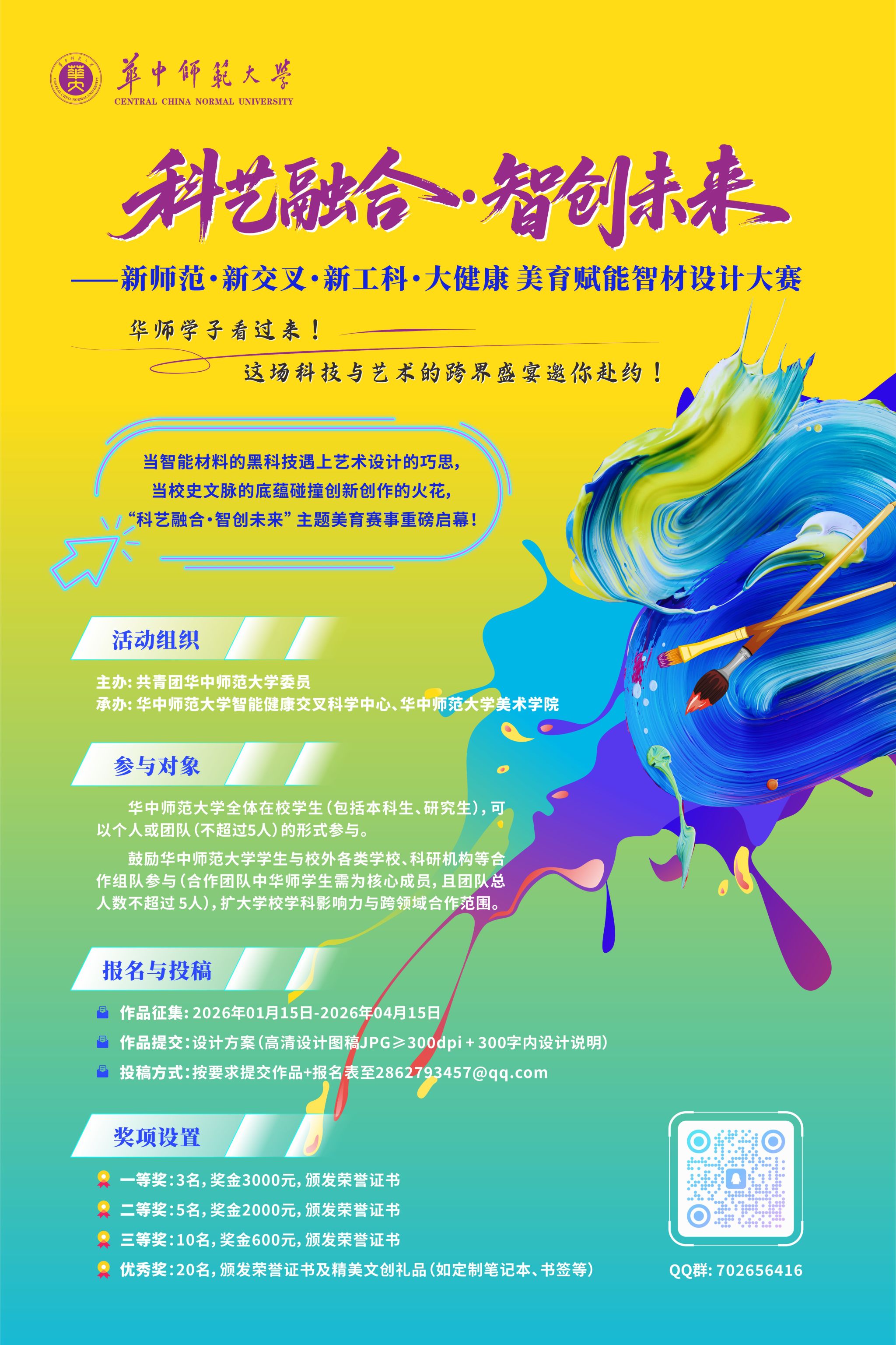共青团华中师范大学委员会、华中师范大学智能健康交叉科学中心、华中师范大学美术学院联合举办“科艺融合・智创未来” —— 新师范・新交叉・新工科・大健康 美育赋能智材设计大赛。现面向全校学生及校外合作机构征集结合中心智能材料的设计作品,助力学校“未来校园、智慧校园、生态校园、人文校园”建设,服务区域经济高质量发展。